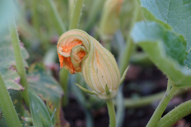 My squash plants (zucchini and pumpkins) are exploding right now...so many blooms...so much produce. We are already harvesting and eating the zucchini, but the pumpkins will stay on the vine and continue to grow for another month or two.